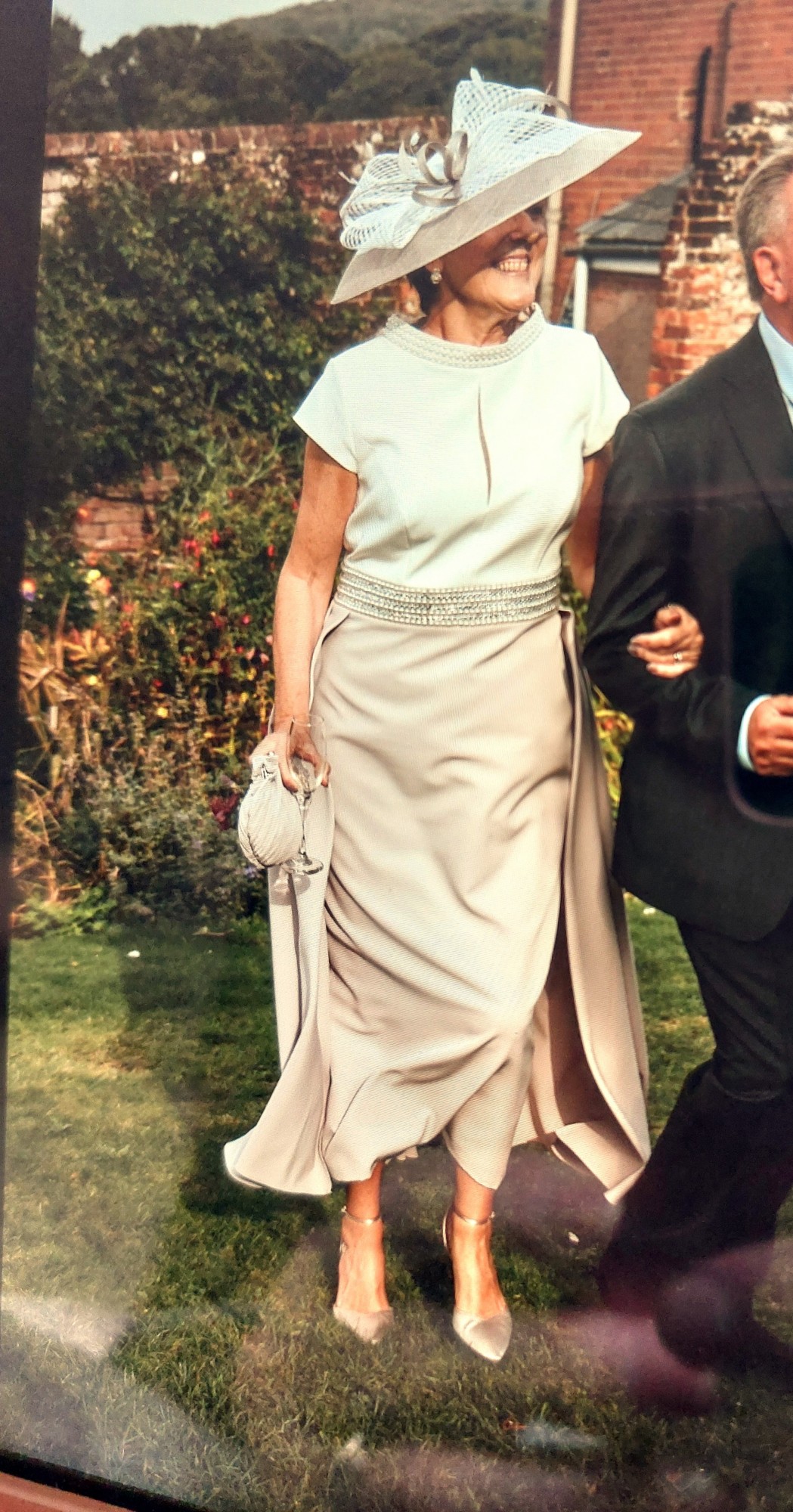 Beautiful fitted mid-length ivory and taupe crepe dress with pearl and beading embellishment. High beaded neck and beaded waistline with billowy half over skirt in same fabric.