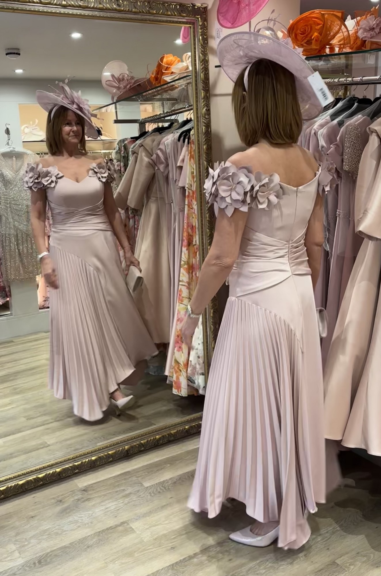 Stunning A line dress with part pleat skirt,Bardot neckline adorned with delicate floral embellishments.