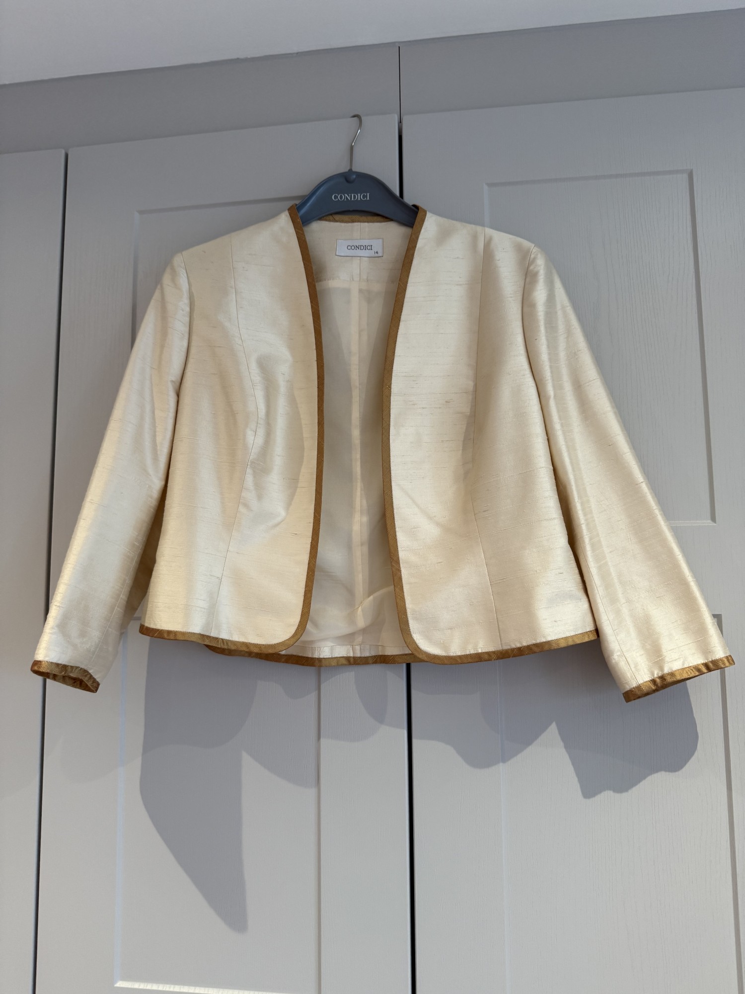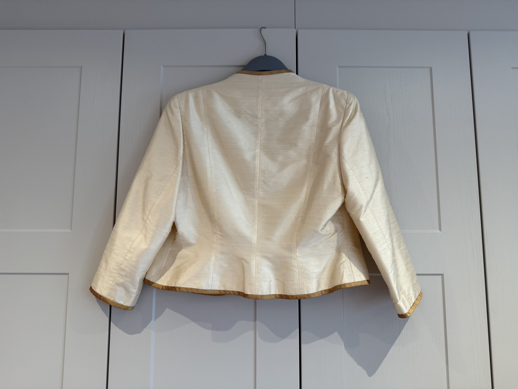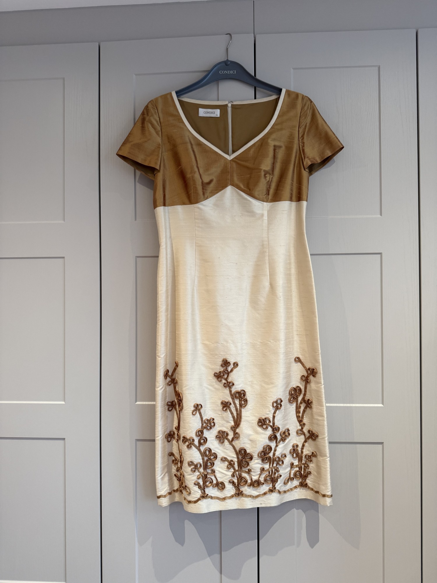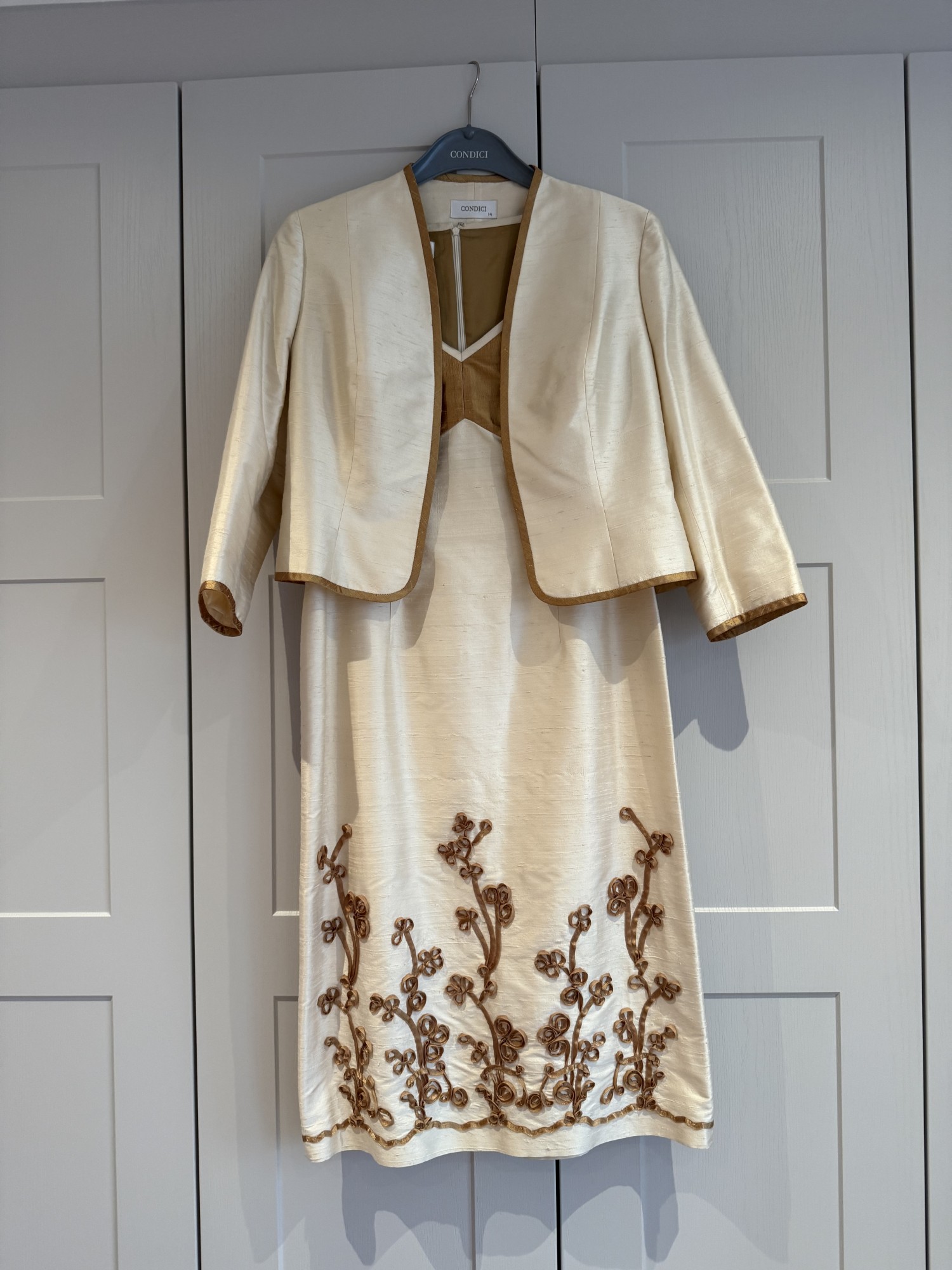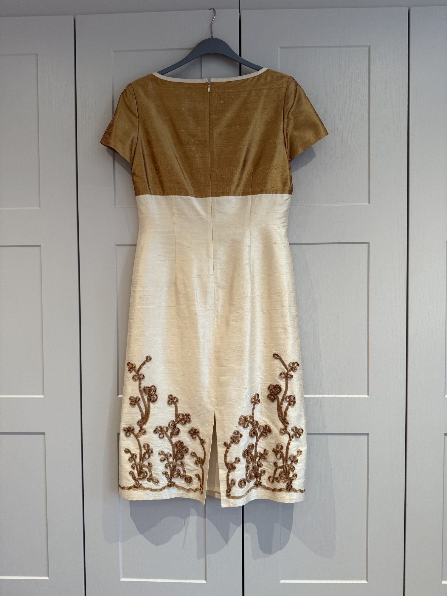 A knee-length, cream-colored dress with intricate bronze-toned floral appliqué/embroidery on the skirt. The matching, cropped bolero jacket is trimmed with a contrasting bronze piping, coordinating with the dress's details.