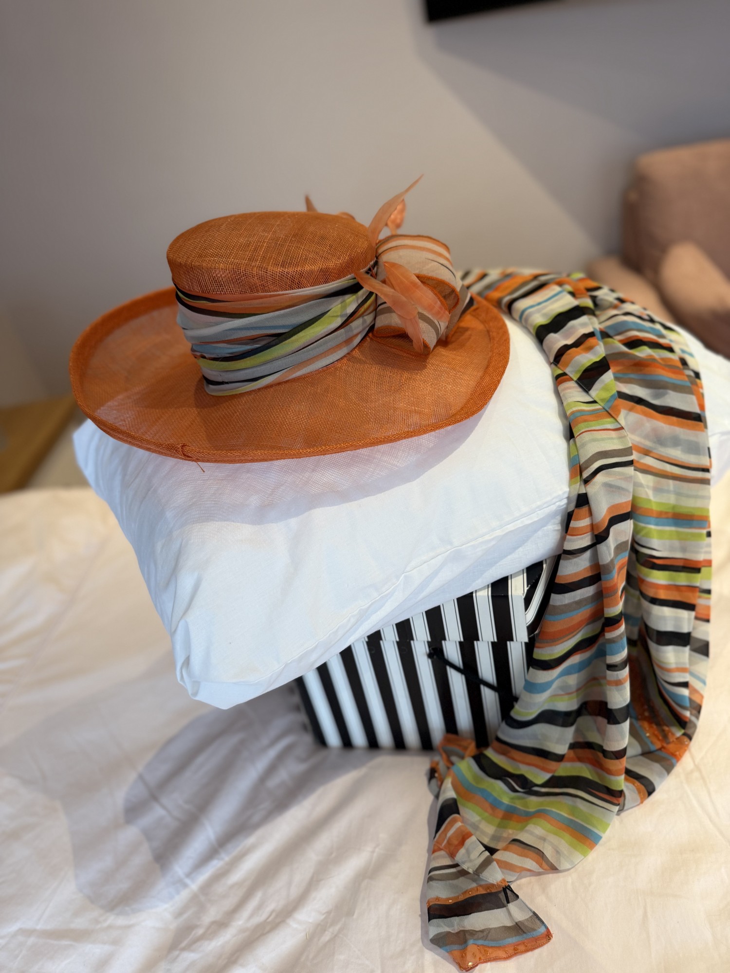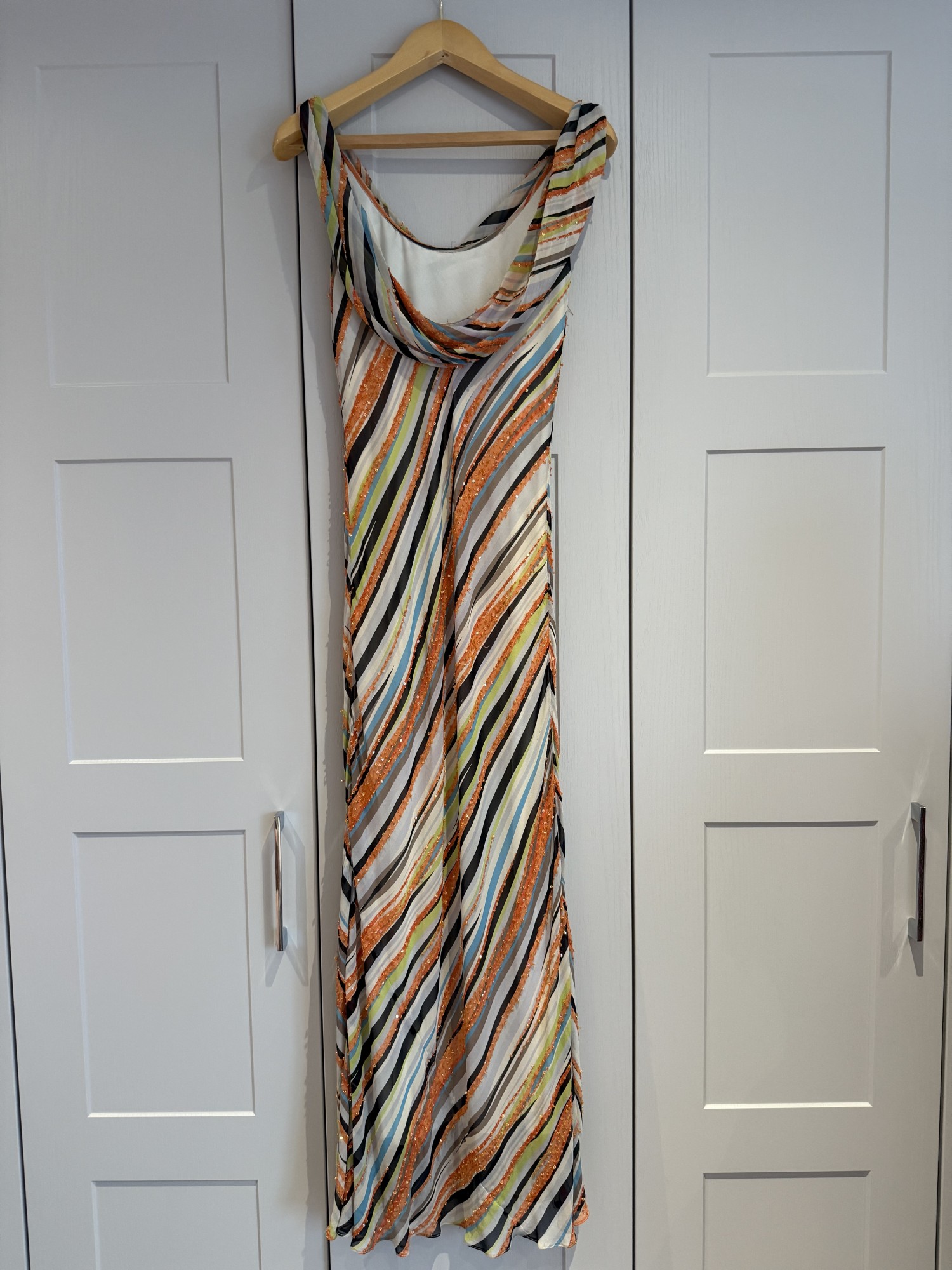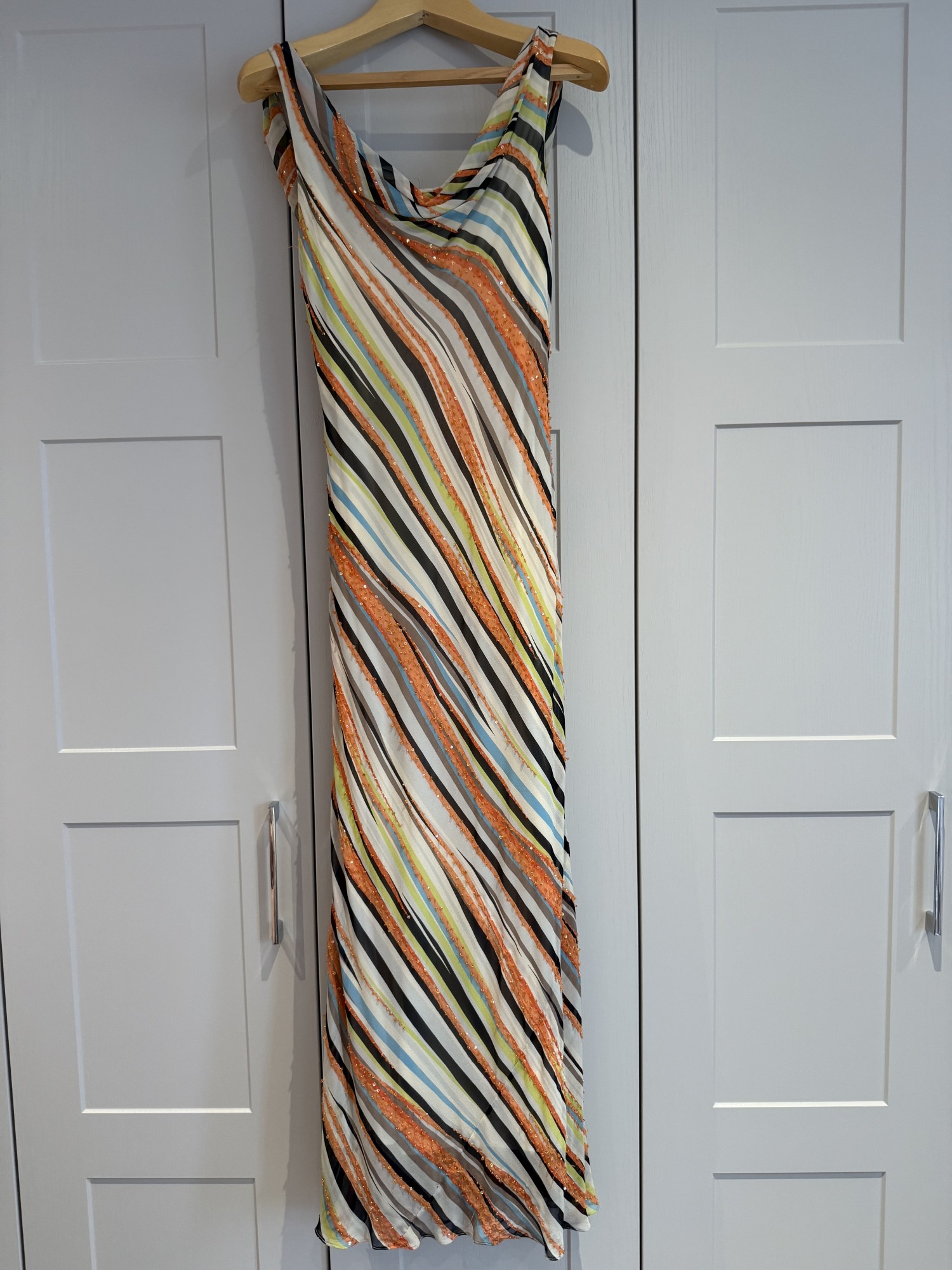 After Six dress & Hat is a Orange multi-coloured striped beaded maxi dress with an asymmetrical, cowl neckline and a bias cut silhouette with beautiful beading throughout.