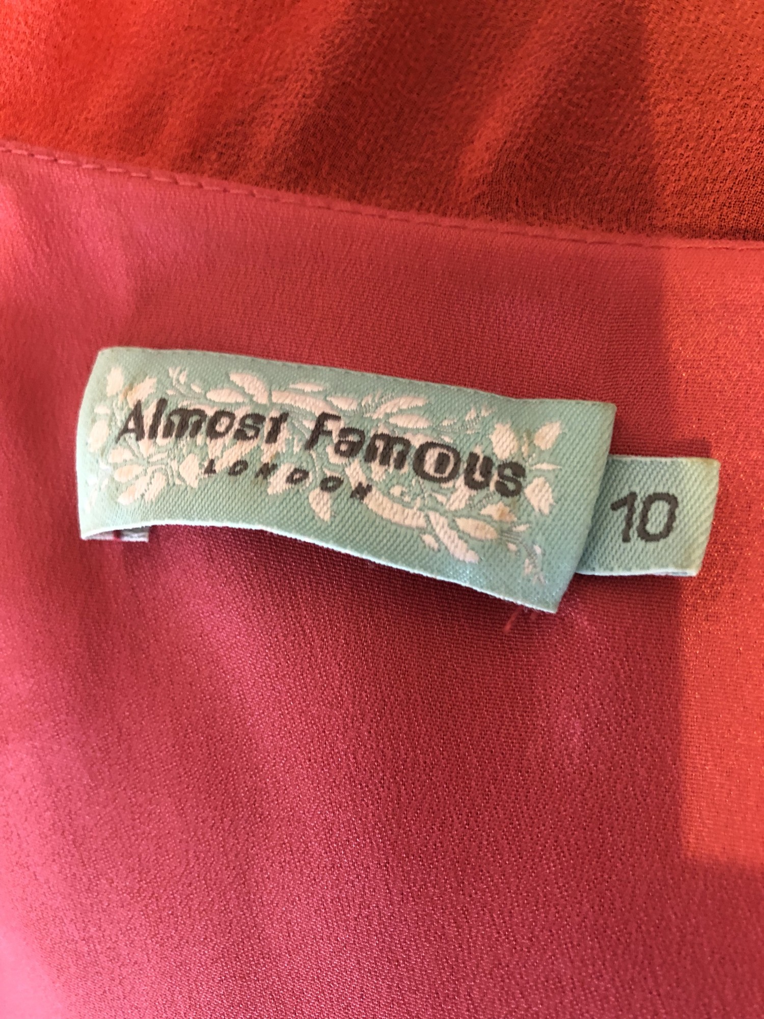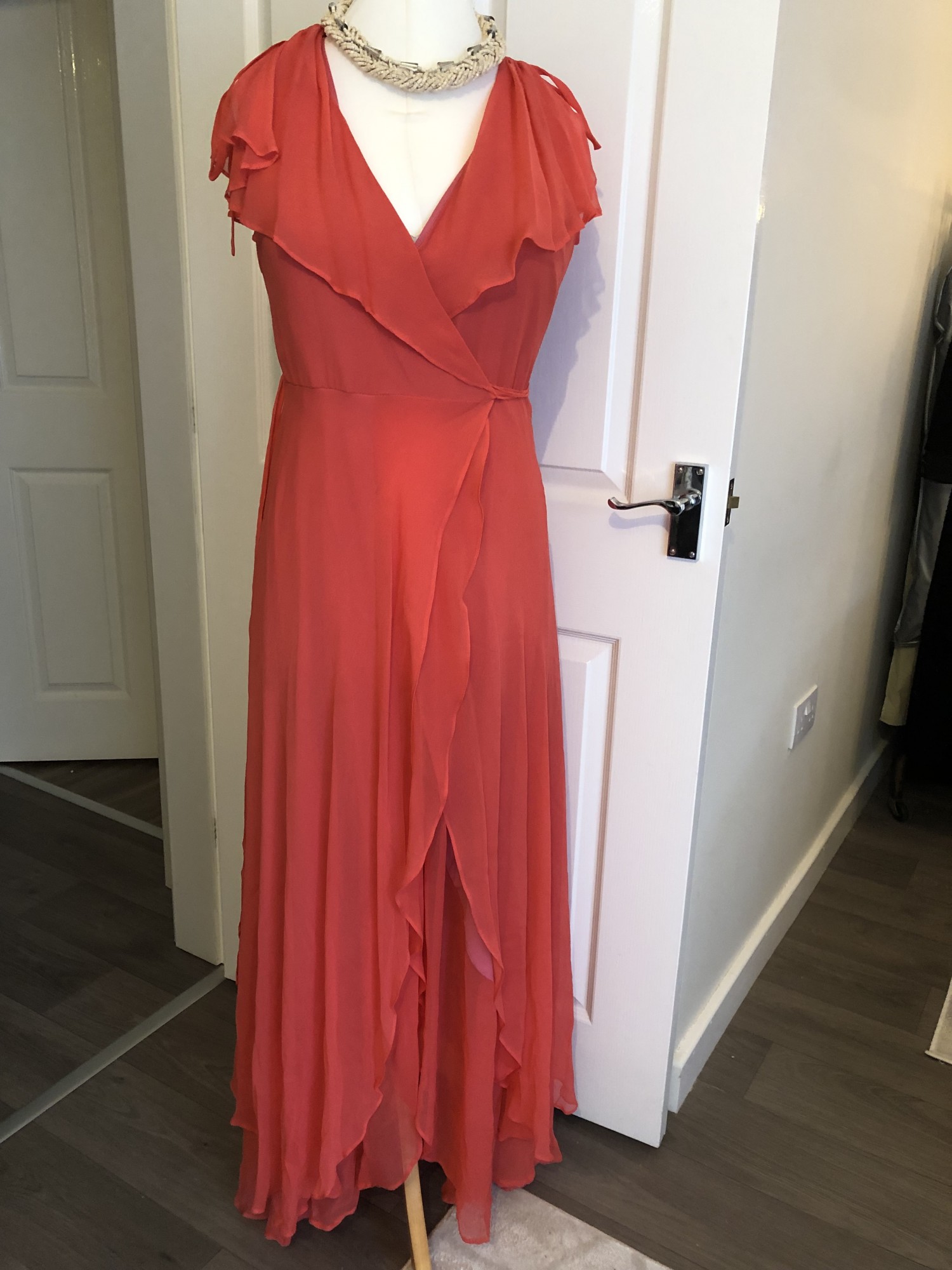 An elegant silk dress is vibrant coral colour, Fully lined with frill details in the front, featuring an attached cape on the back, short sleeves with ties, perfect for any special occasion, As new worn once for a wedding last year. Design by Amost Famous