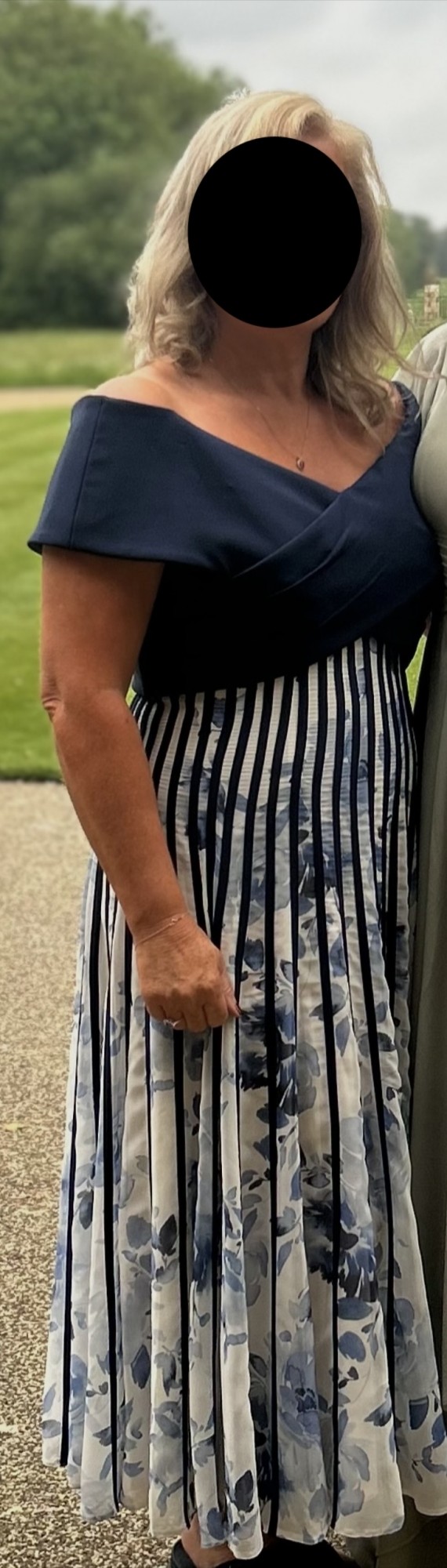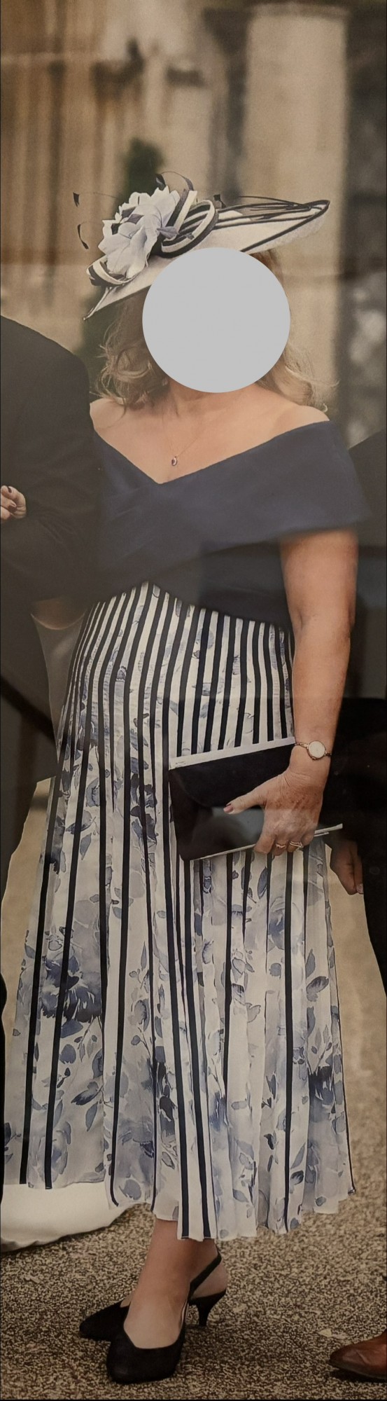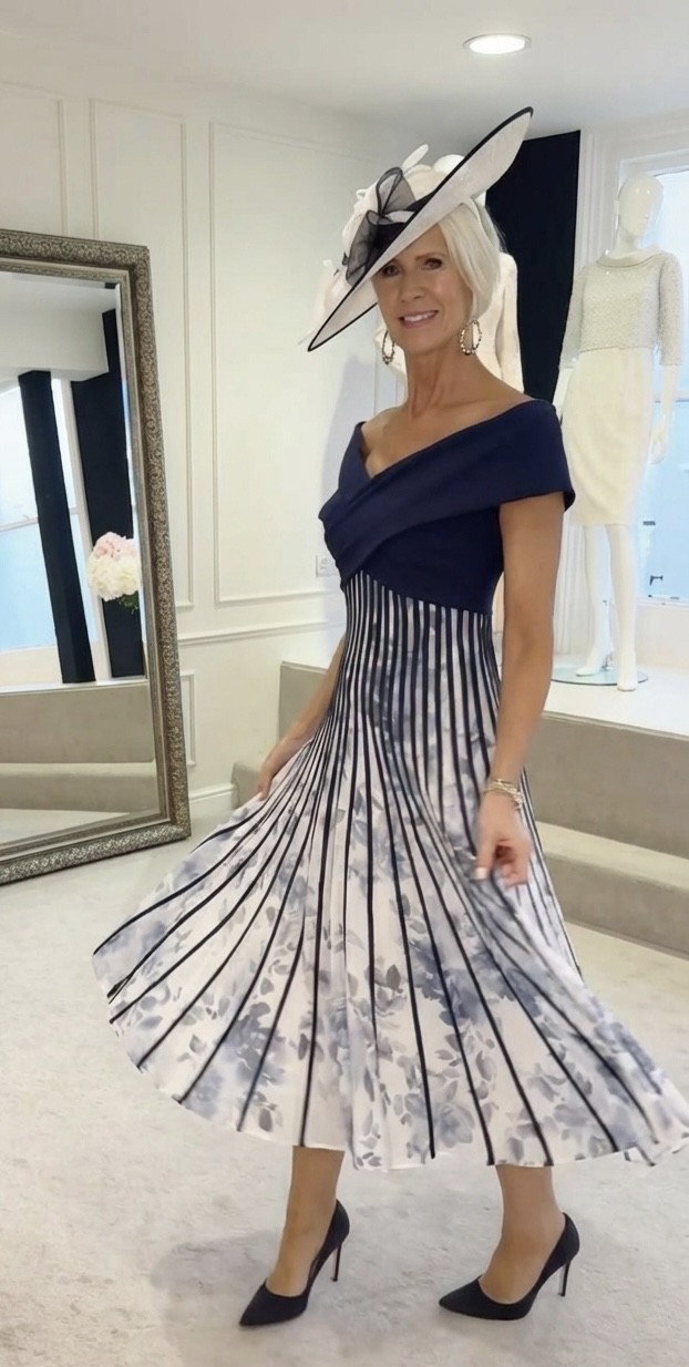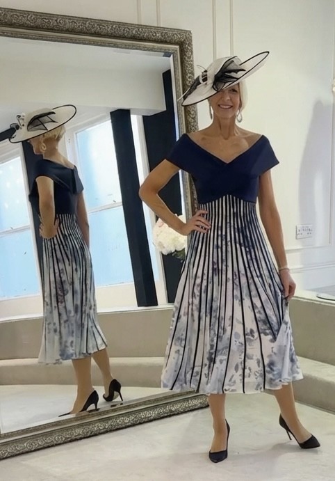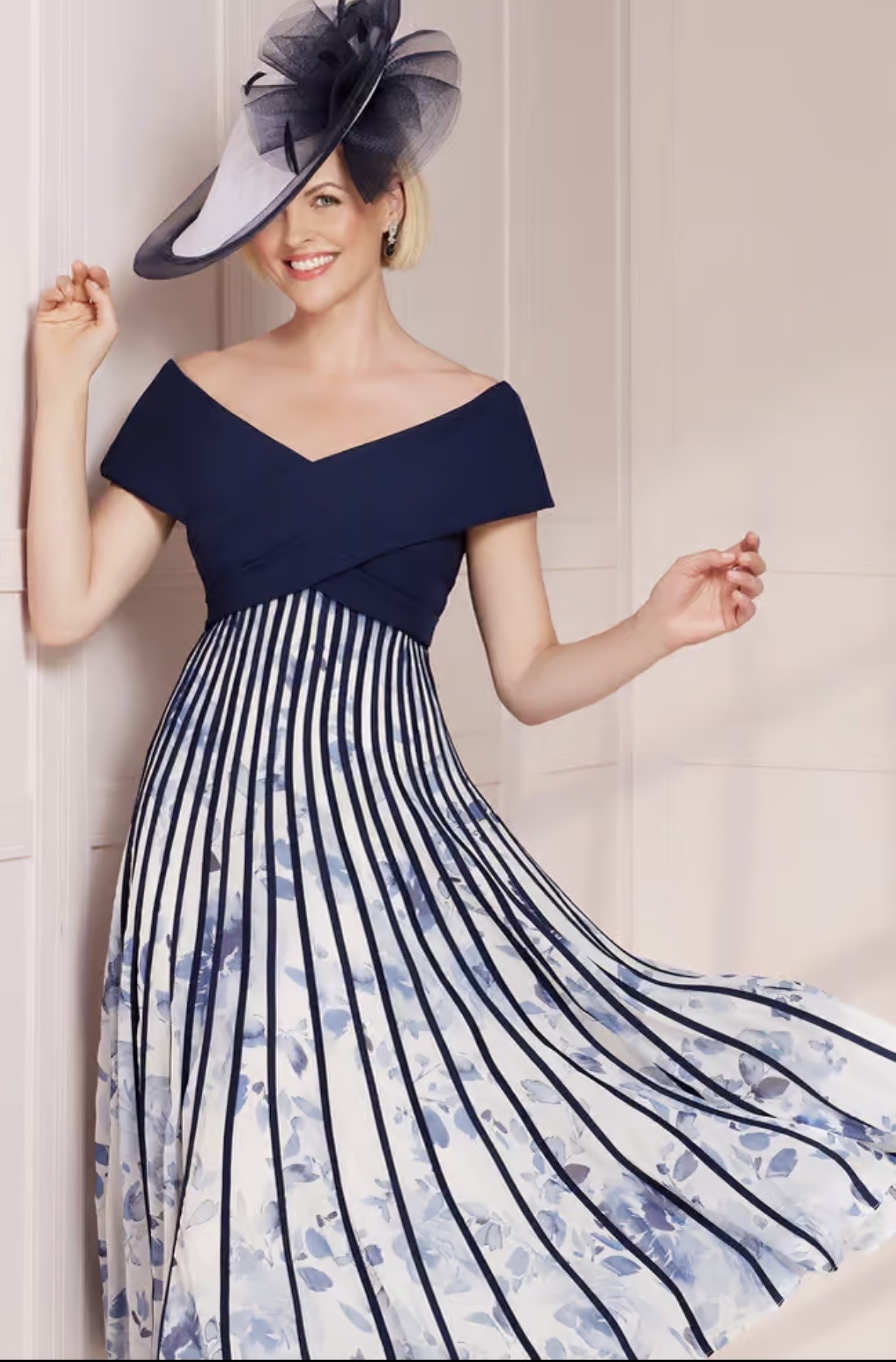 As new, only worn for a few hours and received so many compliments. Purchased from the wedding Shop in Colchester. This striking off-shoulder dress is the epitome of modern sophistication, showcasing a sleek navy bodice that elegantly transitions into a dramatic off-shoulder neckline. The dress’s bodice wraps around to accentuate the figure, then flares out into a full, flowing skirt adorned with bold navy stripes atop a delicate floral print. The unique pleating of the stripes creates a mesmerizing optical effect, adding movement and depth. Perfect for formal events, this dress pairs seamlessly with a statement hat, making it a complete, head-turning ensemble.