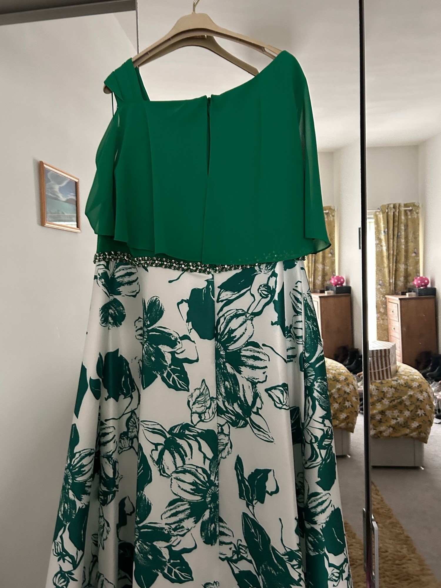 Absolutely stunning Invitations green MOB dress in green. With sweeping chiffron effect, bling waistline and A line skirt. Size 22. Felt extremely glamorous and recieved lots of compliments. I am 5'4" and it came to my lower calf (matching hat for sale seperately)