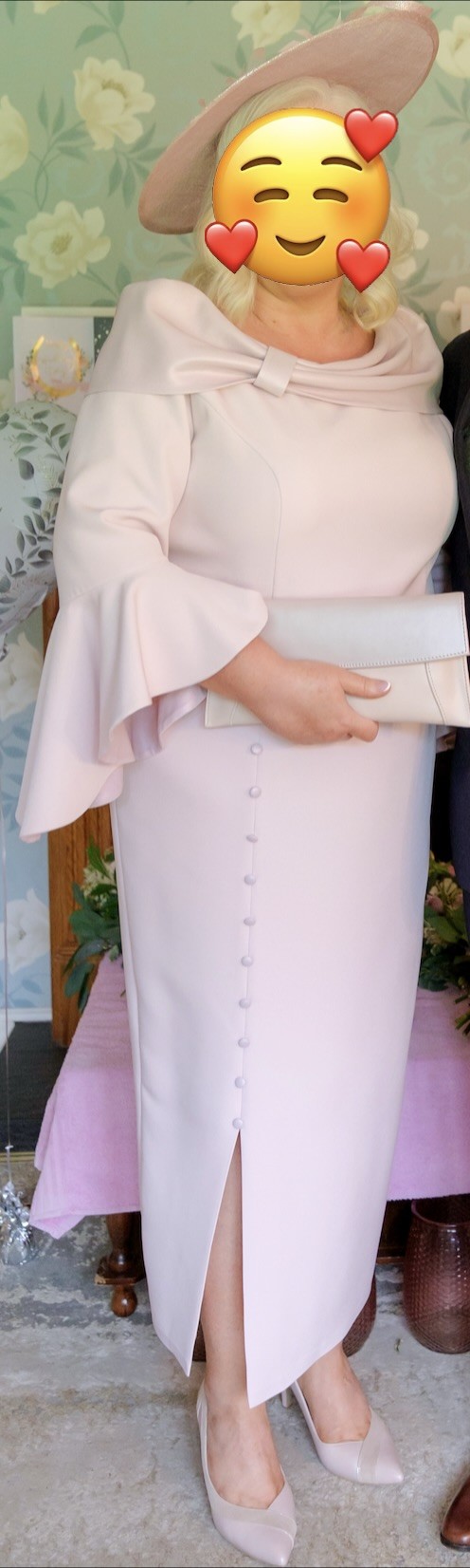 Baby pink Mother of the Bride Anoola D405 mid-length dress. Flattering, slimming fit, cowl neckline with slight shimmer detail around collar, belt and inset of sleeve. 3/4 length flute sleeve, and button detail on front and back of dress.