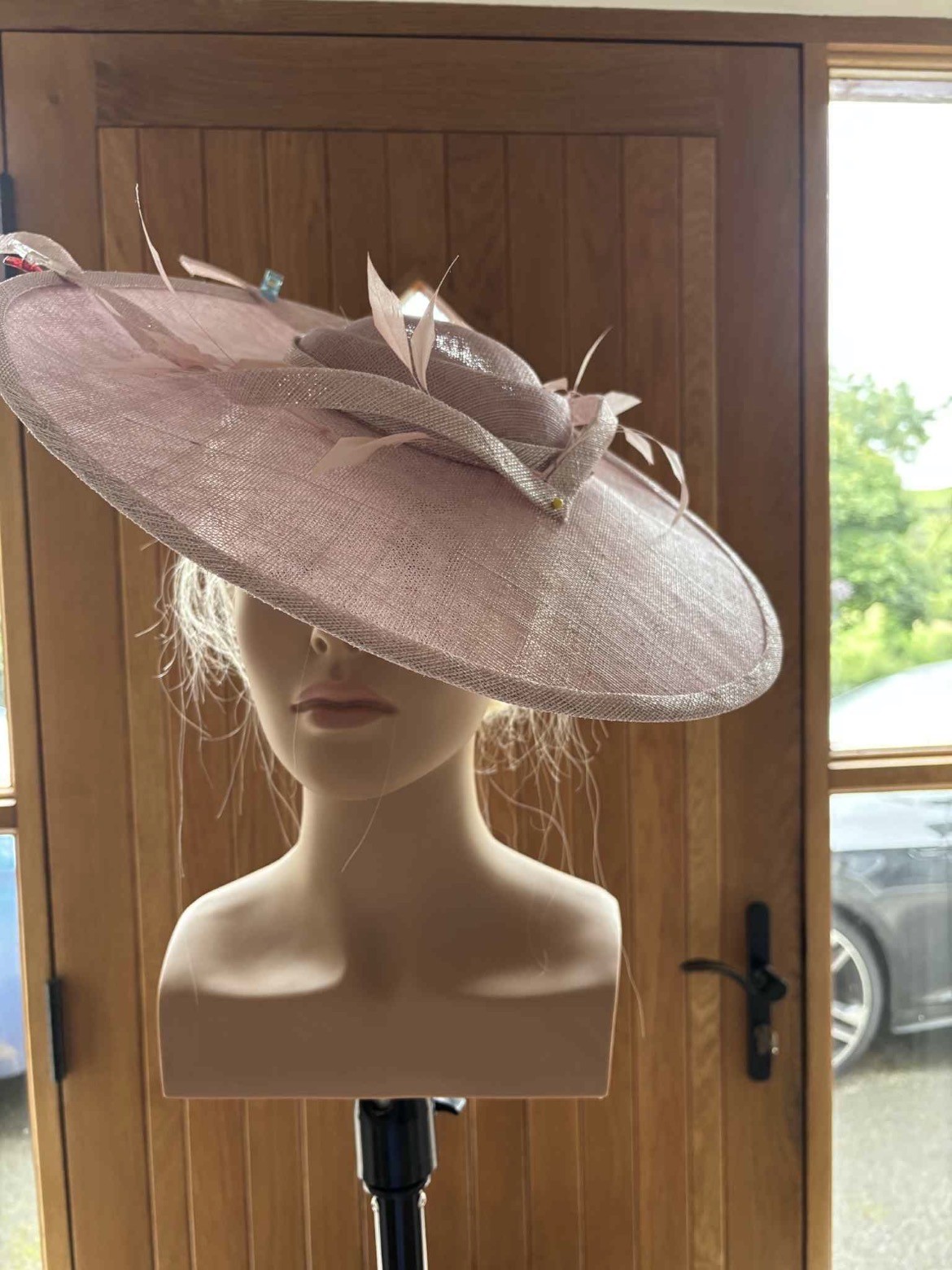 Also included: Custom made boutique Mother of the Bride fascinator in matching baby pink colour. Elegant wide brim fascinator with shimmer detail specially made to compliment the dress, with soft feather detailing.