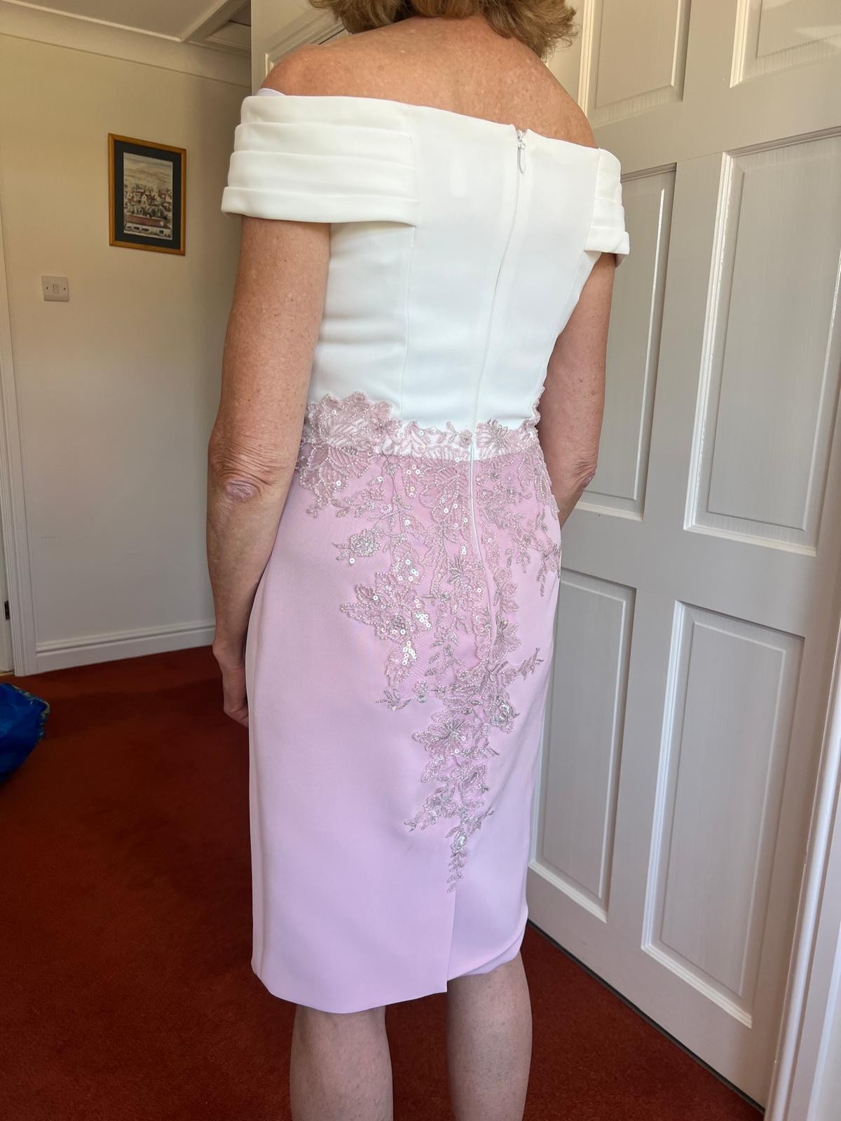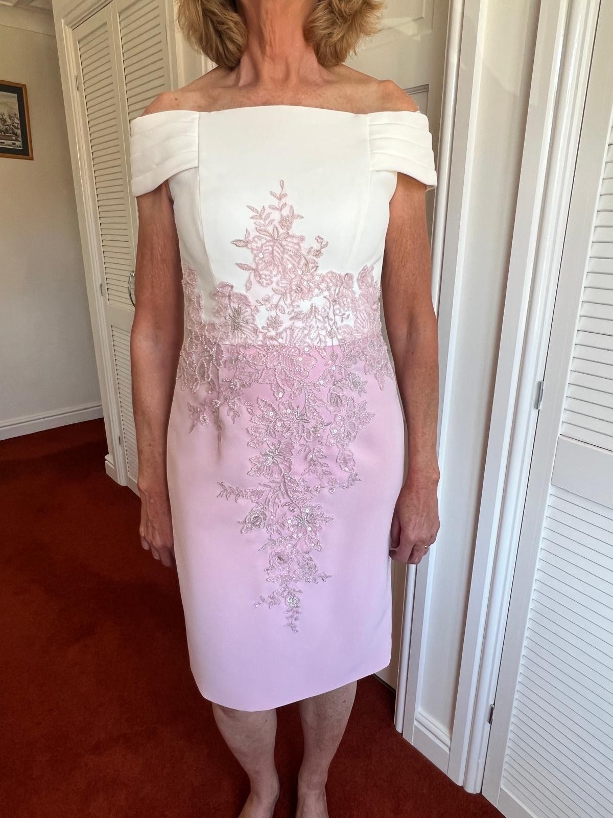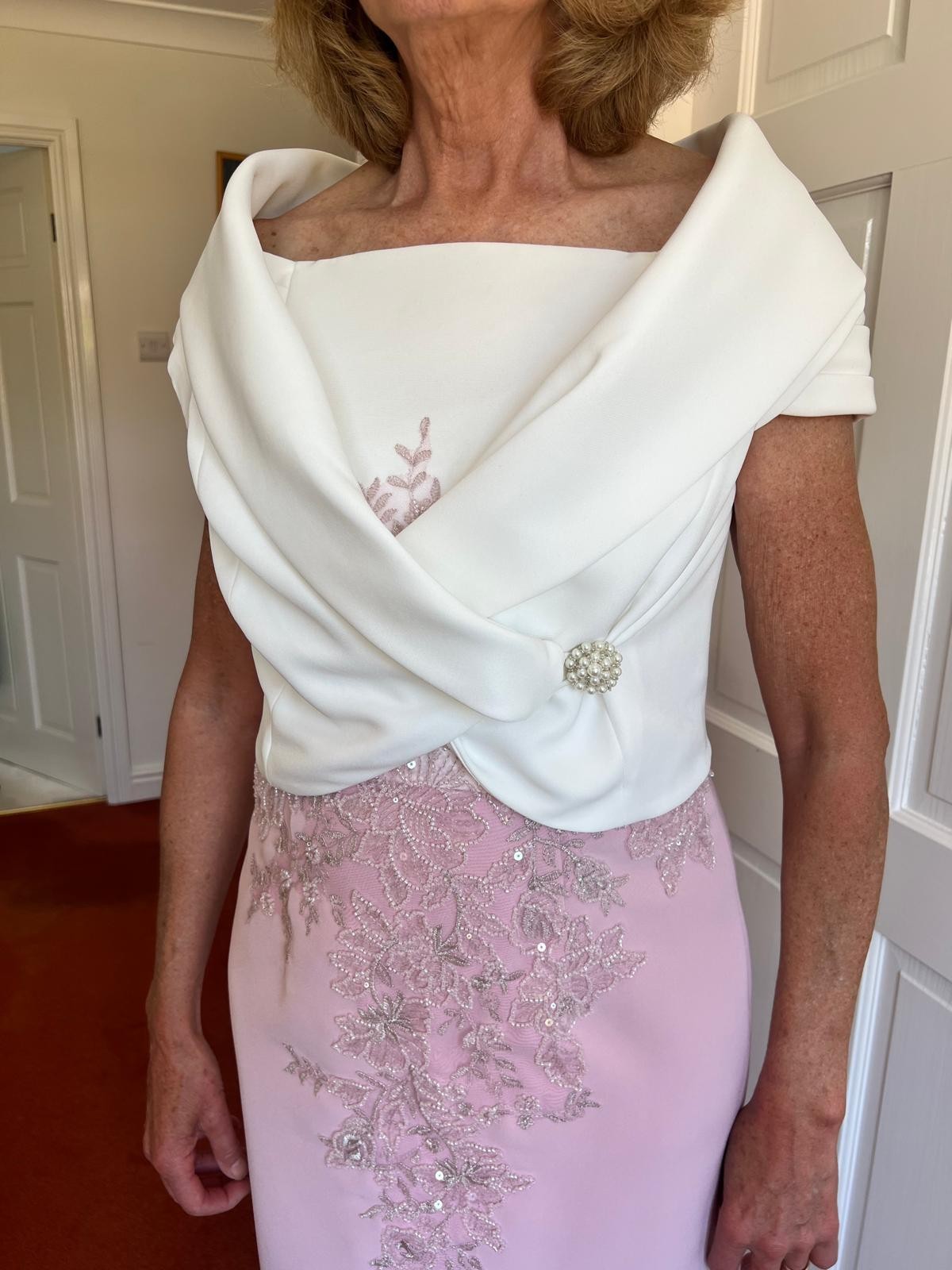 Blush/white dress with white jacket. Sits just off the shoulder.
