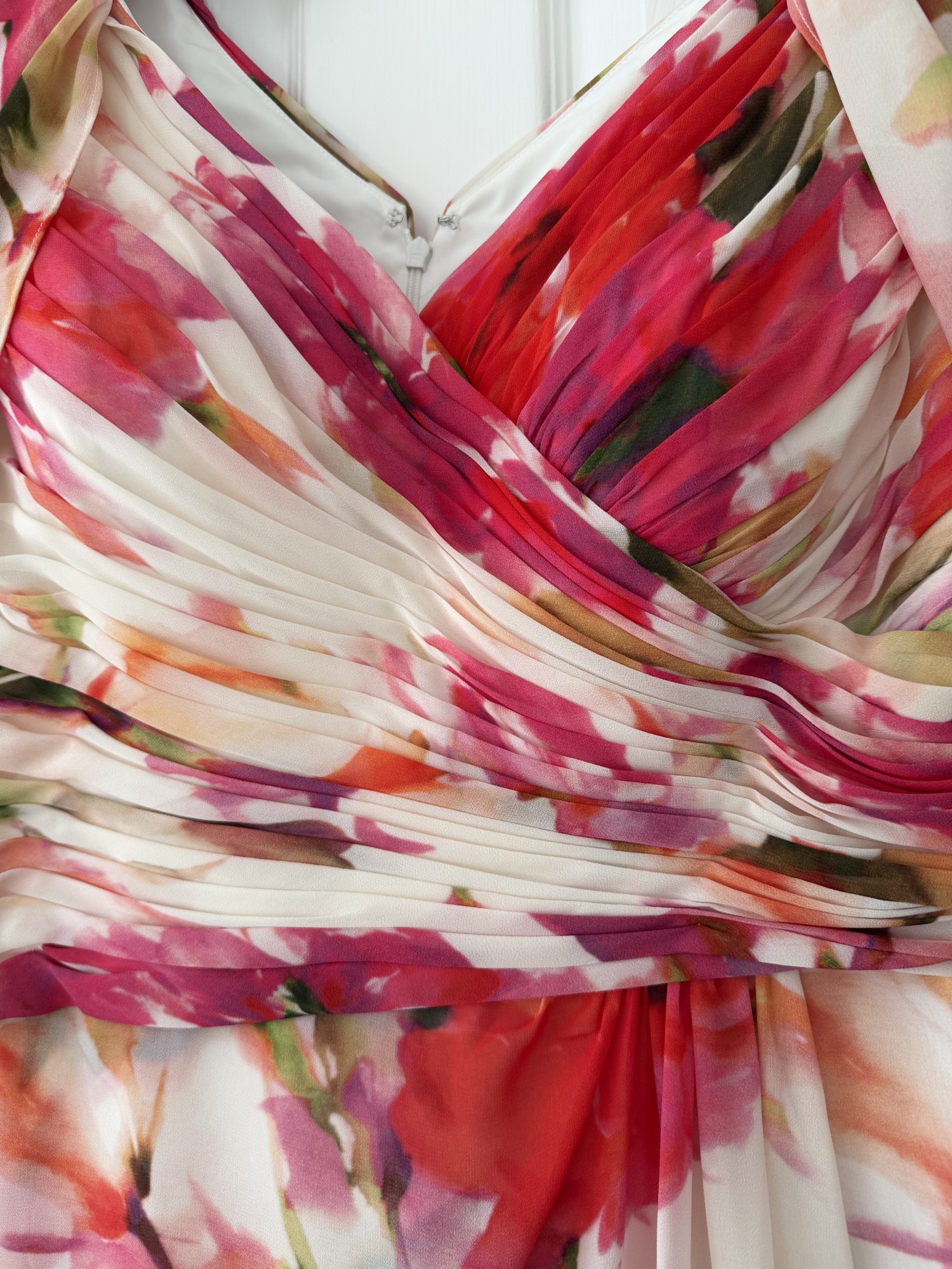 it is a very fine floaty chiffon, longer at back than front.  Draped cap style sleeve, fine lining, delicate pleating on bodice
