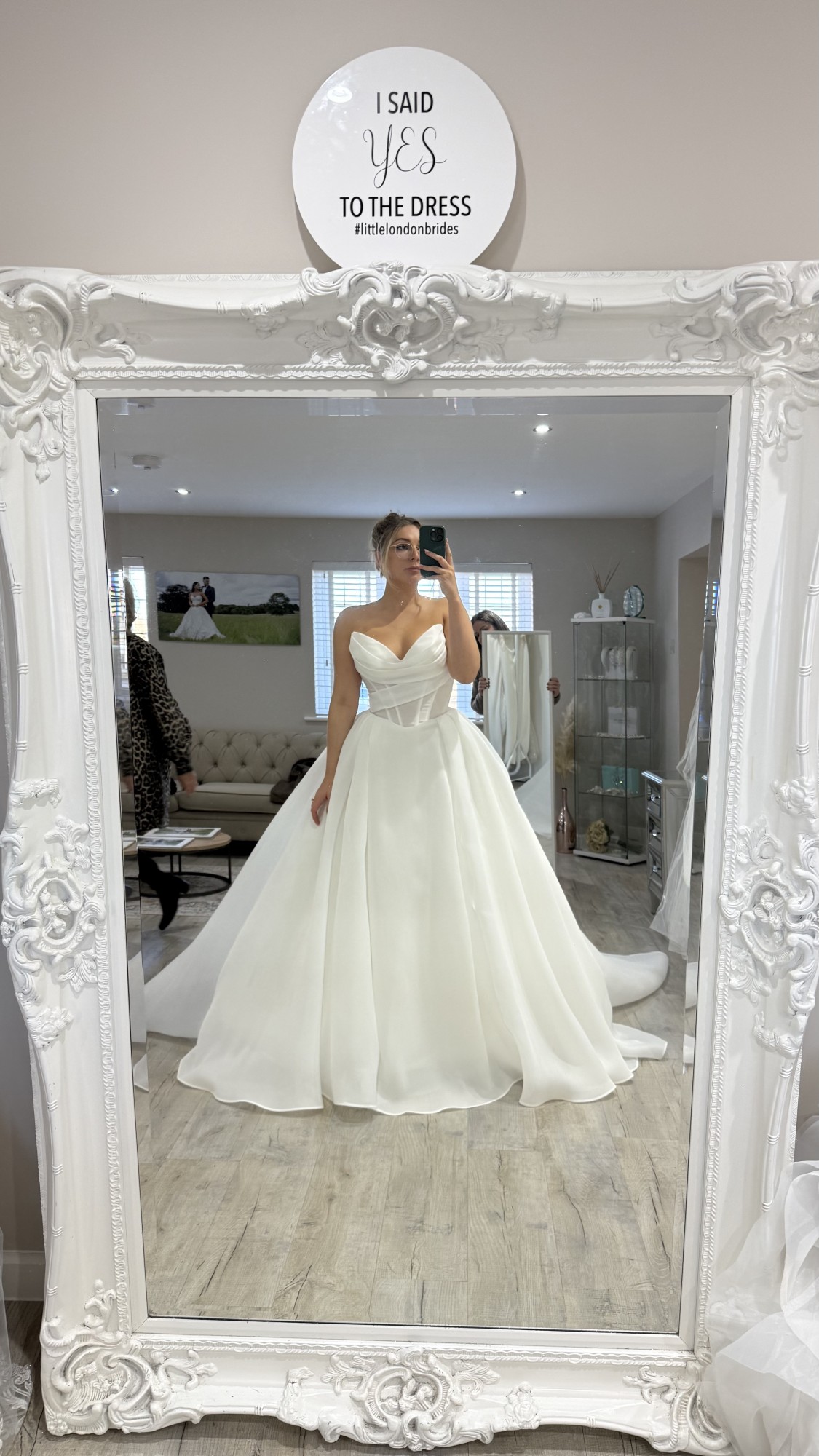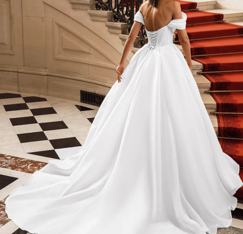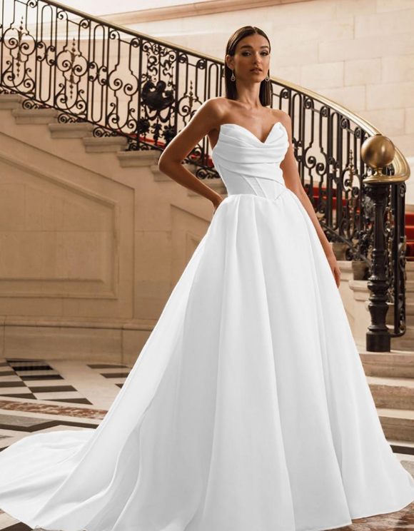 The Filippa is a romantic organza ballgown featuring a draped sweetheart neckline with delicate detachable off-the-shoulder straps, allowing you to style it strapless or with soft sleeves. The structured corset bodice and flattering basque waistline beautifully shape the waist before flowing into a dramatic full skirt with a subtle high slit and elegant train. A lace-up corset back with bow detail completes the look for a timeless, fairytale-inspired bridal style.