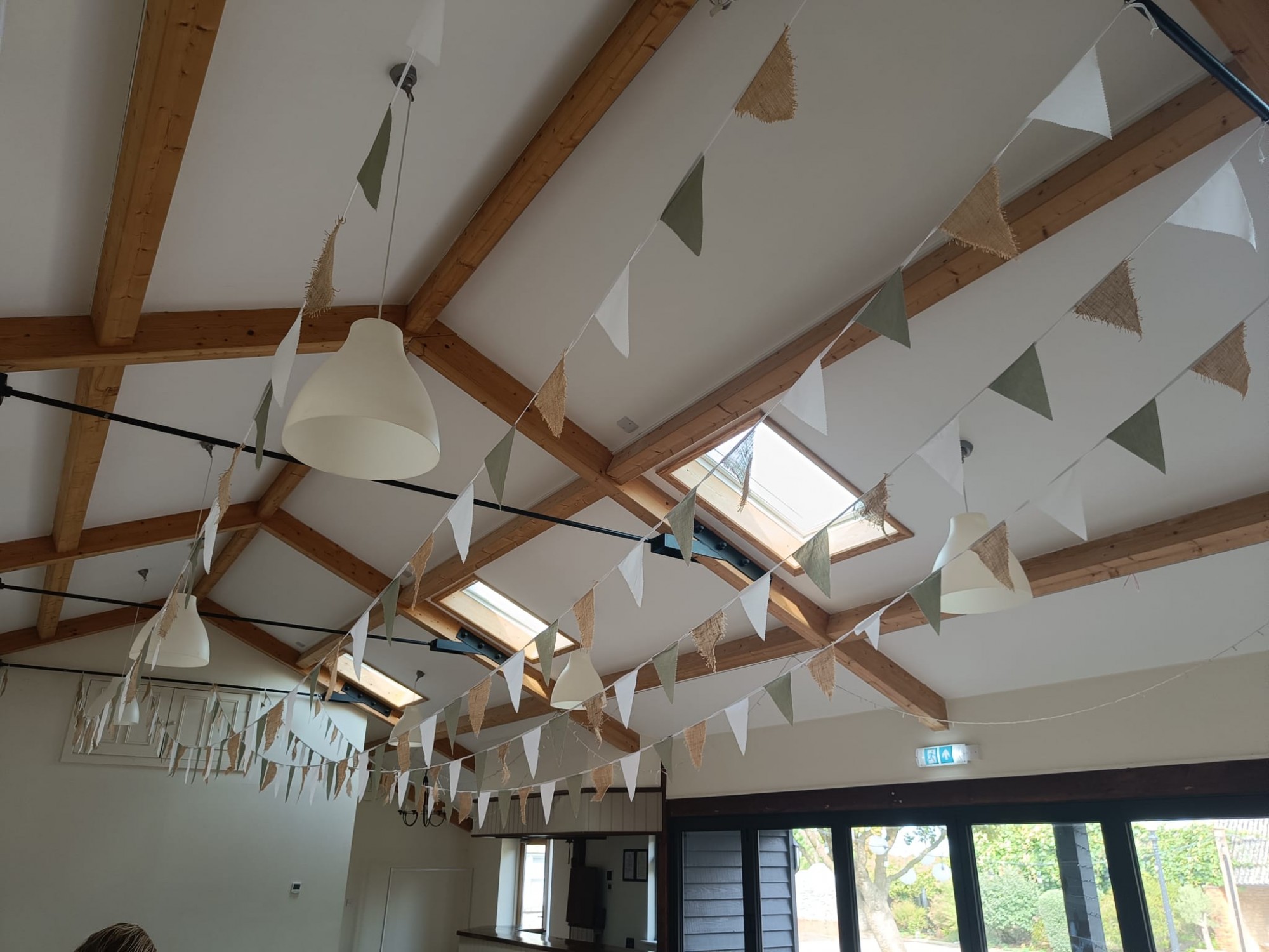 Gorgeous white, sage green and hessian homemade bunting. We used to fill a smaller barn in our wedding, used as a backdrop for a singing group.